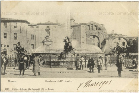 Первая остановка — 1953 год. Выглядит все примерно так же, только машин гораздо меньше, и большинство — «фиаты». В этом году площадь получит свое имя, всего через 6 лет после референдума, на который явились почти все итальянцы, имеющие право голоса (вот это явка!) и решили, что монархии — нет, а республике — да! По этому поводу и переименовали площадь, которая до этого звалась площадью Экседры (piazza dell’Esedra). Экседра — это полукруглая ниша с полукруглым же потолком. Как сцена летнего театра, точнее, амфитеатра, который когда-то стоял на месте площади.